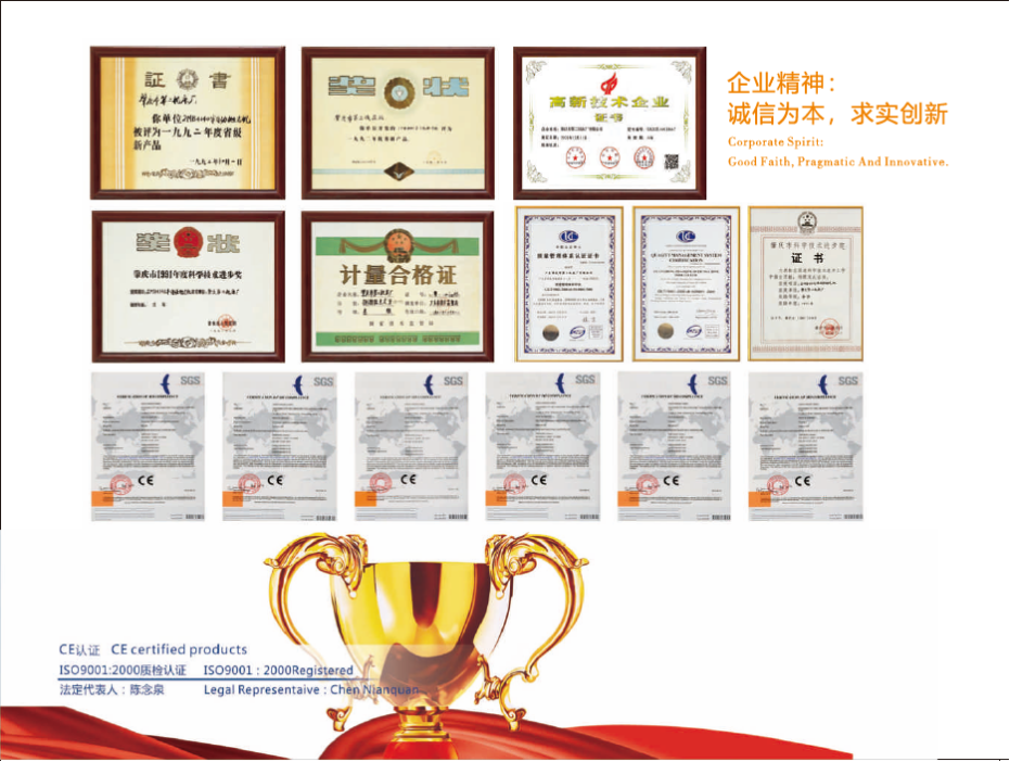 公司十分注重人才和科研?,F(xiàn)有員工230多人,其中,技術(shù)研發(fā)人員占了39人,廠房總占地面積達(dá)五萬(wàn)多平方米,擁有160多臺(tái)進(jìn)口的和國(guó)產(chǎn)的先進(jìn)生產(chǎn)加工設(shè)備、檢測(cè)設(shè)備,包括:德國(guó)大型導(dǎo)軌磨床、英國(guó)滾齒機(jī)床、意大利花鍵滾齒機(jī)床、法國(guó)銑床、大型坐標(biāo)式鏜床、立式加工中心、萬(wàn)能工具顯微鏡、大型工具顯微鏡等。公司引進(jìn)了先進(jìn)的國(guó)際企業(yè)管理理念和多元化的管理模式,擁有自主進(jìn)出口權(quán),是一家集產(chǎn)品創(chuàng)新,開發(fā)、生產(chǎn),銷售于一體的高新技術(shù)企業(yè)。公司產(chǎn)品一直引領(lǐng)業(yè)內(nèi)創(chuàng)新潮流,并長(zhǎng)期保持著健康、穩(wěn)定、快速的增長(zhǎng)。公司拋光機(jī)械設(shè)備占國(guó)內(nèi)市場(chǎng)同類產(chǎn)品70%以上的份額,國(guó)外市場(chǎng)占公司總銷售額的30%。公司憑借五十多年的機(jī)械研制經(jīng)驗(yàn)和精湛工藝,以及三十多年在器皿加工及拋光方面的經(jīng)驗(yàn),先后獲得多個(gè)產(chǎn)品獎(jiǎng)項(xiàng):2MB4140半自動(dòng)拋光機(jī)在一九九二年榮獲肇慶市科技進(jìn)步獎(jiǎng)及廣東省優(yōu)秀新產(chǎn)品獎(jiǎng)。多個(gè)產(chǎn)品獲得了國(guó)家發(fā)明專利權(quán)及擁有CE認(rèn)證。公司已通過了ISO9001:2000質(zhì)量體系認(rèn)證。