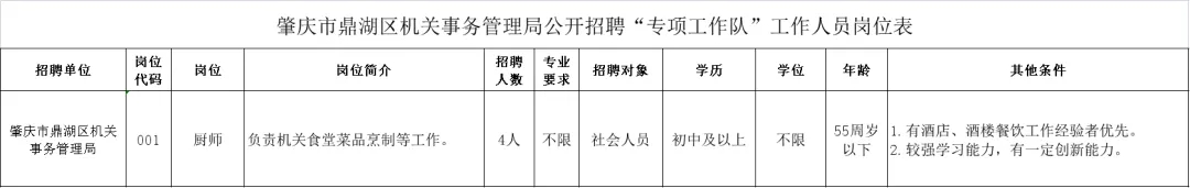 2、報名要求:本次招聘實行現(xiàn)場報名,有意者請攜帶《報名登記表》(附件2)(一式兩份)、《肇慶市“一員一檔”登記卡》(附件3)、個人近期1寸免冠彩色照片3張,有效二代身份證、畢業(yè)證書、學(xué)位證書(原件及復(fù)印件),一并交至肇慶市鼎湖區(qū)機(jī)關(guān)事務(wù)管理局辦公室,報名地點:肇慶市鼎湖區(qū)坑口街道鼎湖區(qū)人民政府大院內(nèi)一樓書吧;