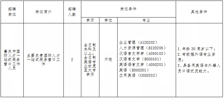 2、報(bào)名方式:請(qǐng)報(bào)考人員如實(shí)填寫《肇慶市國際人才一站式服務(wù)窗口招聘專職工作人員報(bào)名表》(附件),并上傳表格以及本人身份證、學(xué)歷學(xué)位證書、相關(guān)資格證書等復(fù)印件,電子郵箱:rczx512@126.com。