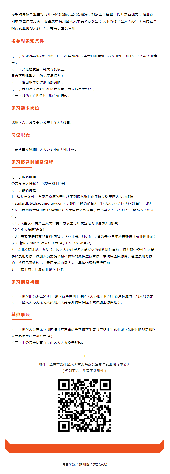 肇慶市端州區(qū)人大常委會辦公室2022年公開招募就業(yè)見習(xí)人員公告