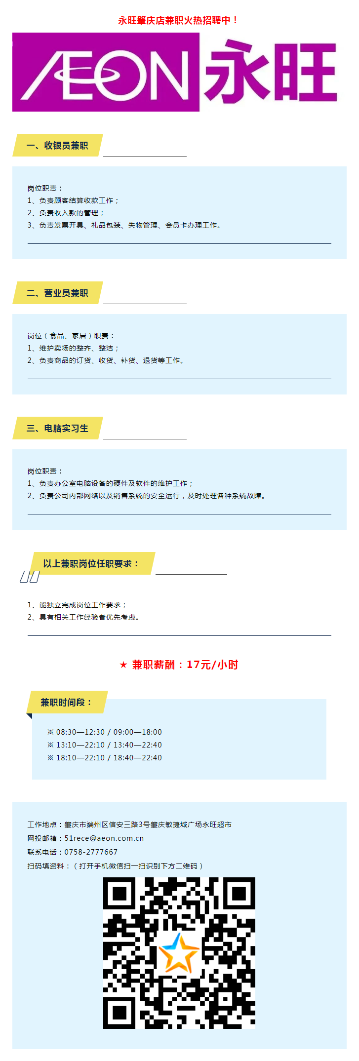 永旺肇慶店招聘電腦實(shí)習(xí)生,收銀/營(yíng)業(yè)員兼職,17元/小時(shí)!