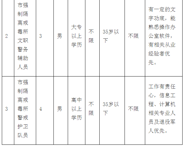 2、市強(qiáng)制隔離戒毒所(以下簡稱:市強(qiáng)戒所)文職警務(wù)輔助人員3名。